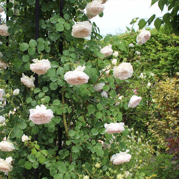 春を中心に楽しむのであれは花首が短く咲くので家庭用のアーチでも良いが、返り咲き性が強いのでオベリスクやポール仕立てに向く。