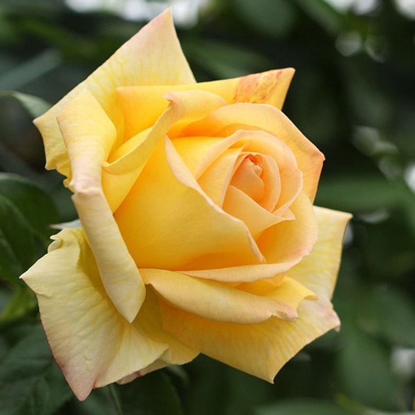 淡黄色の花は半剣弁高芯咲きでボリュームのあるふっくらとした花形。