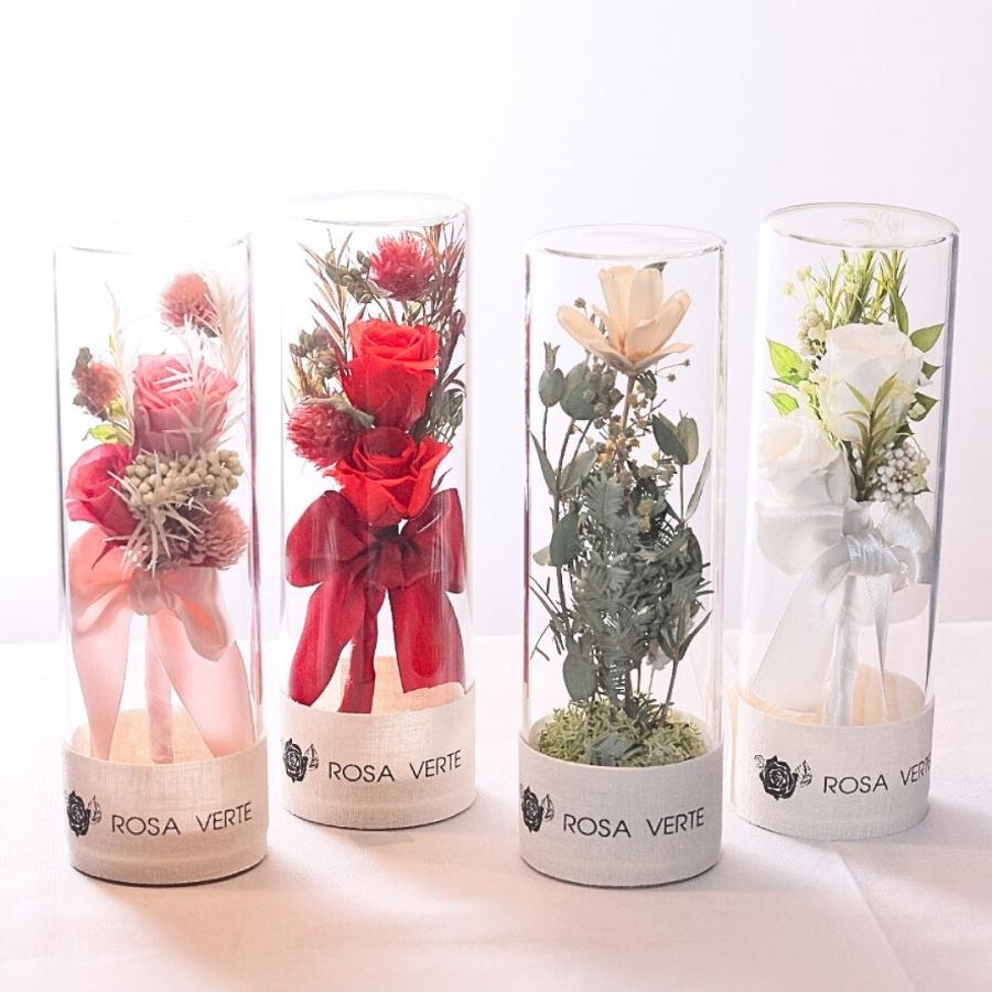 筒型のガラスボトルにプリザーブドフラワーやドライフラワーをアレンジしました。