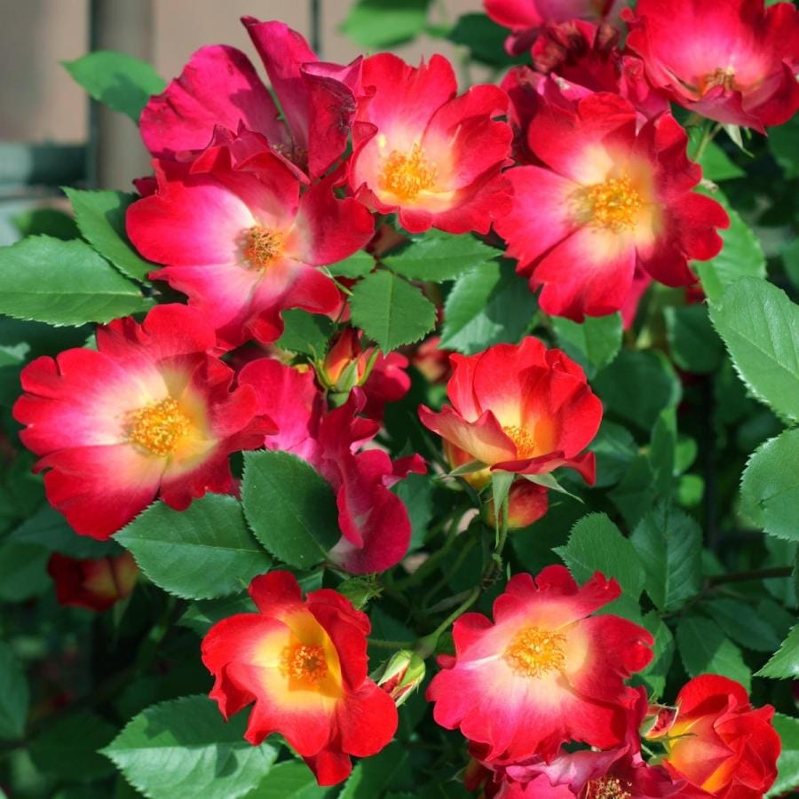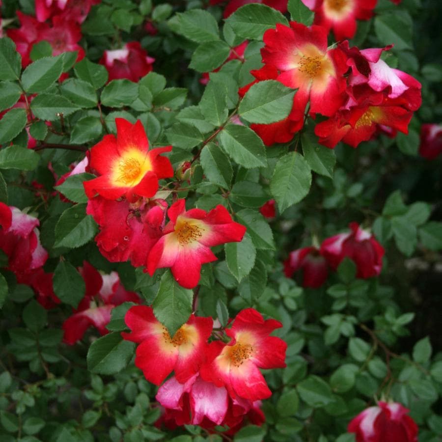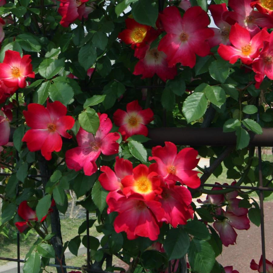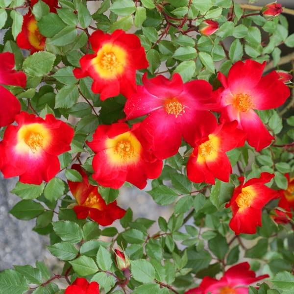 花の中心部がクリームイエロー色~黄色で弁先は赤、一重咲きで弁先は波打ち数輪の房咲き。