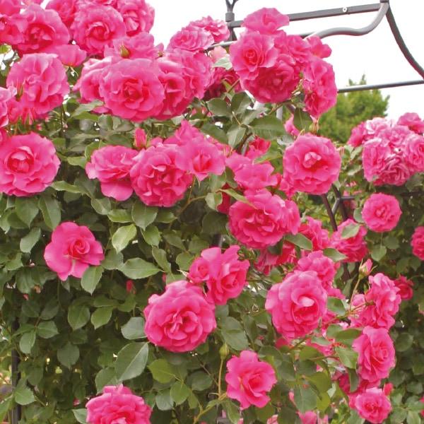 濃いローズ色の花は1~4輪位の房咲き、花弁の質がよく雨にも強い。