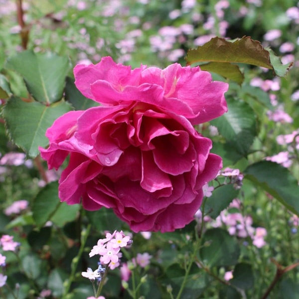 紫色がほんのりとのったローズ色花は波状弁平咲きで1輪もしくは3輪くらいの房咲き。