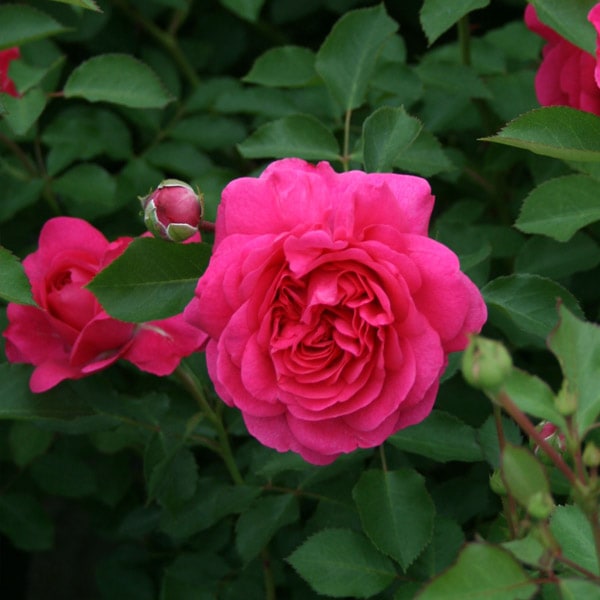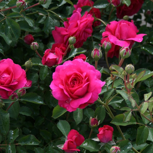 赤色が強いローズ色で3~5輪ほどの房咲きとなる。