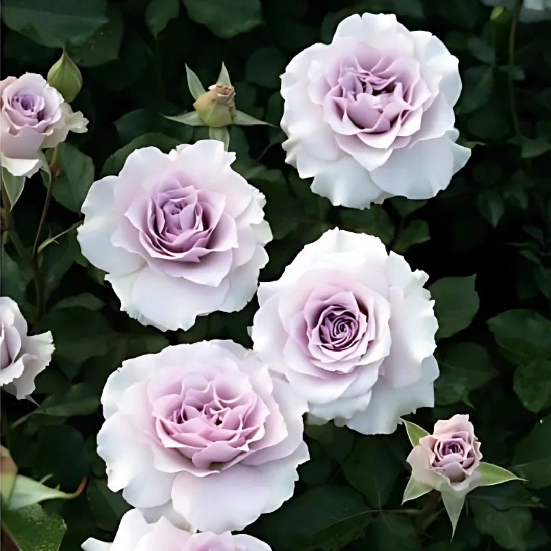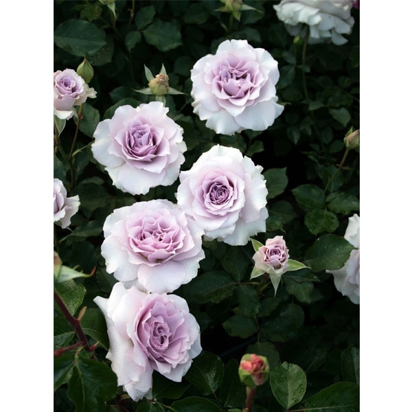 系統はHTだが数輪の房で咲き、丸弁平咲きで花弁の先端は波うち、ブルー・ローズ系の香りがある。