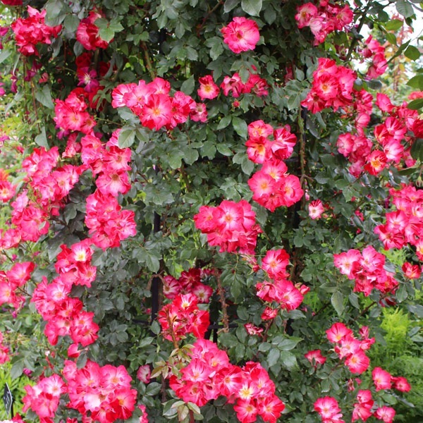 春を中心に楽しむのであれは花首が短く咲くので家庭用のアーチでも良いが、返り咲き性が強いのでオベリスクやポールしたてに向く。