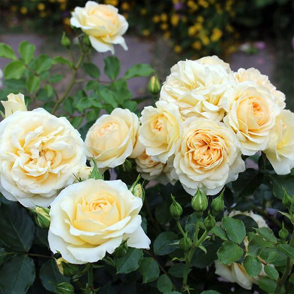 淡黄色の花は形の良いカップ咲きで数輪の房で咲く。
