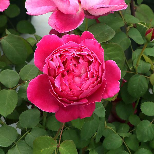 H0.8×0.8mの半横張り性の木立ち性シュラブで、コンパクトにまとまるので鉢栽培にも向く。