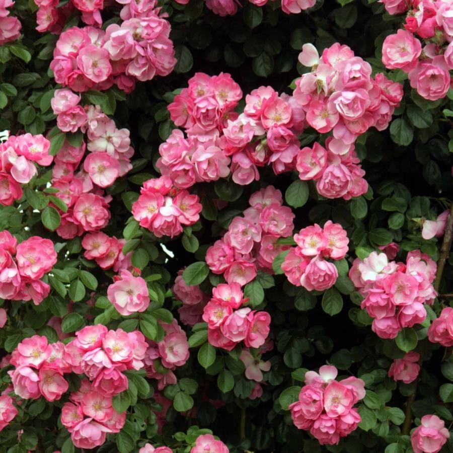 濃い桃色の花は5輪位の房咲き性で半八重のカップ咲き。花の中心部はやや白っぽくなる。