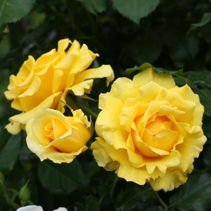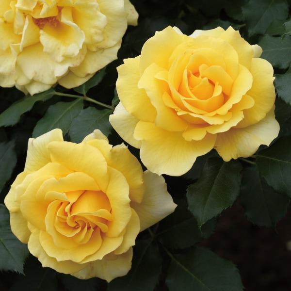 黄色の丸弁カップ咲きで3輪程の房咲きで弁先は波打つ。