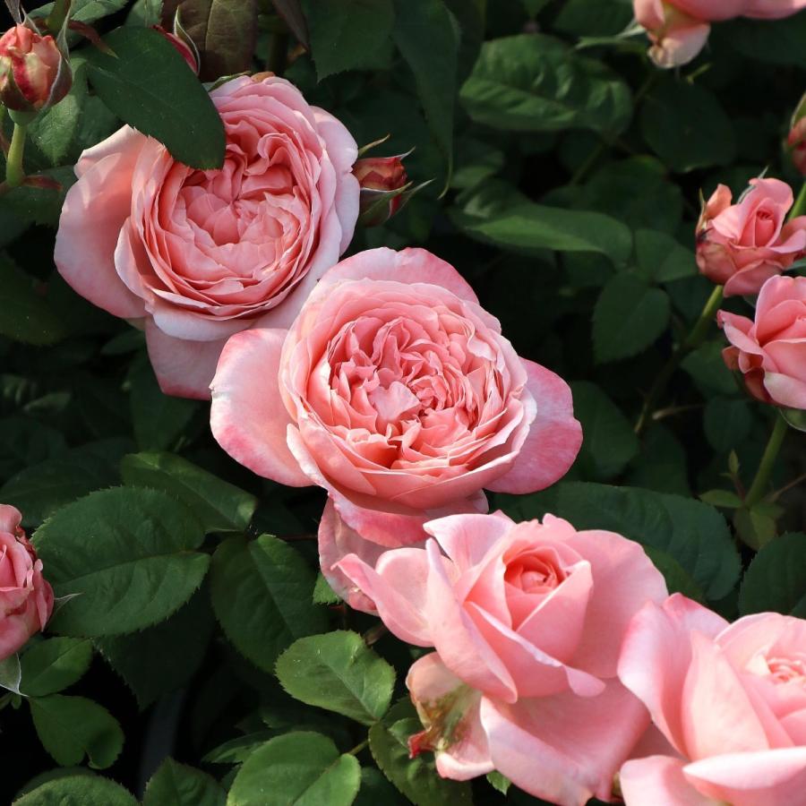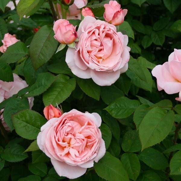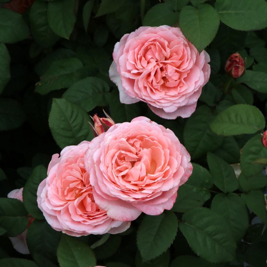 サーモンピンクの花は形のよいカップ咲きで数輪の房で咲く。