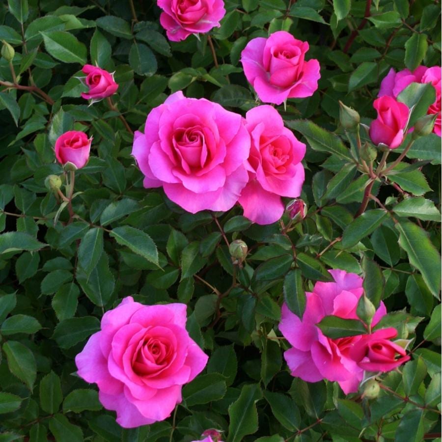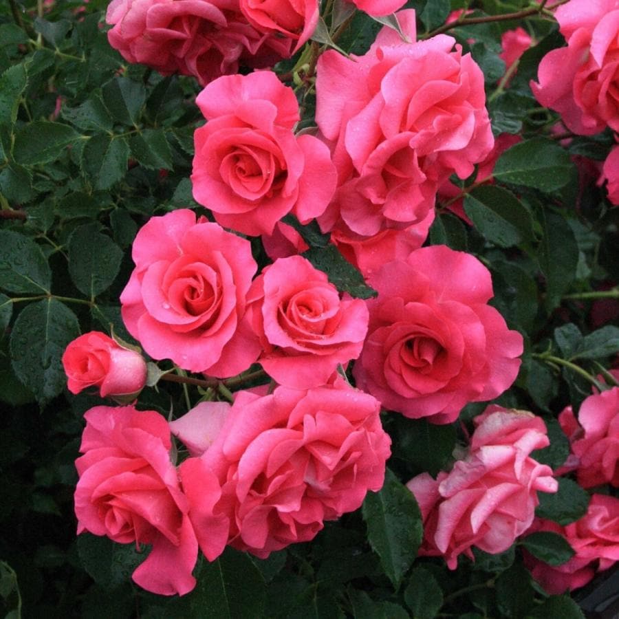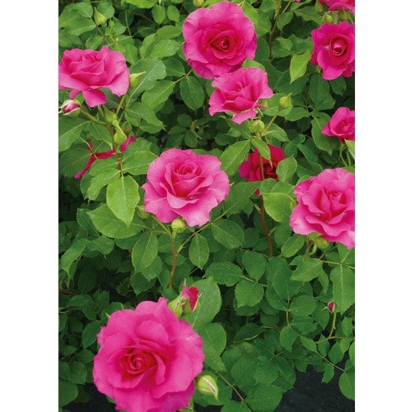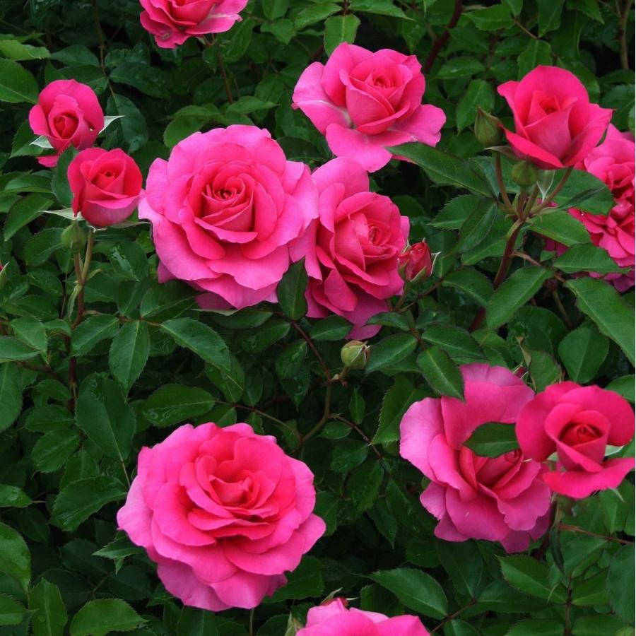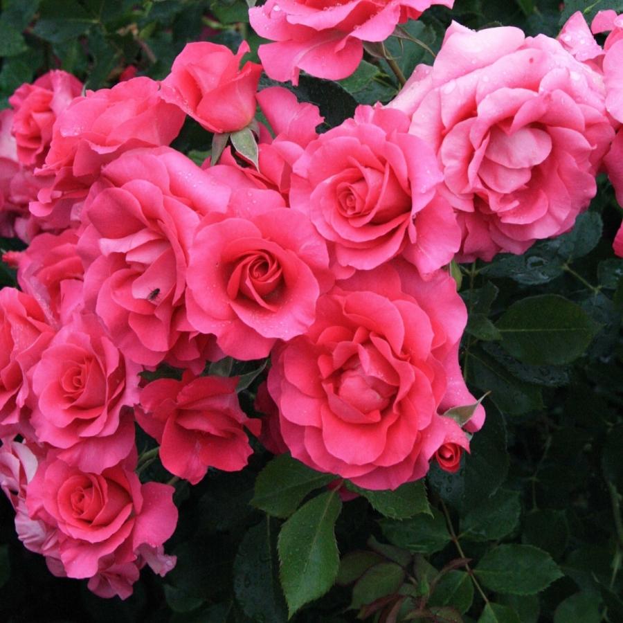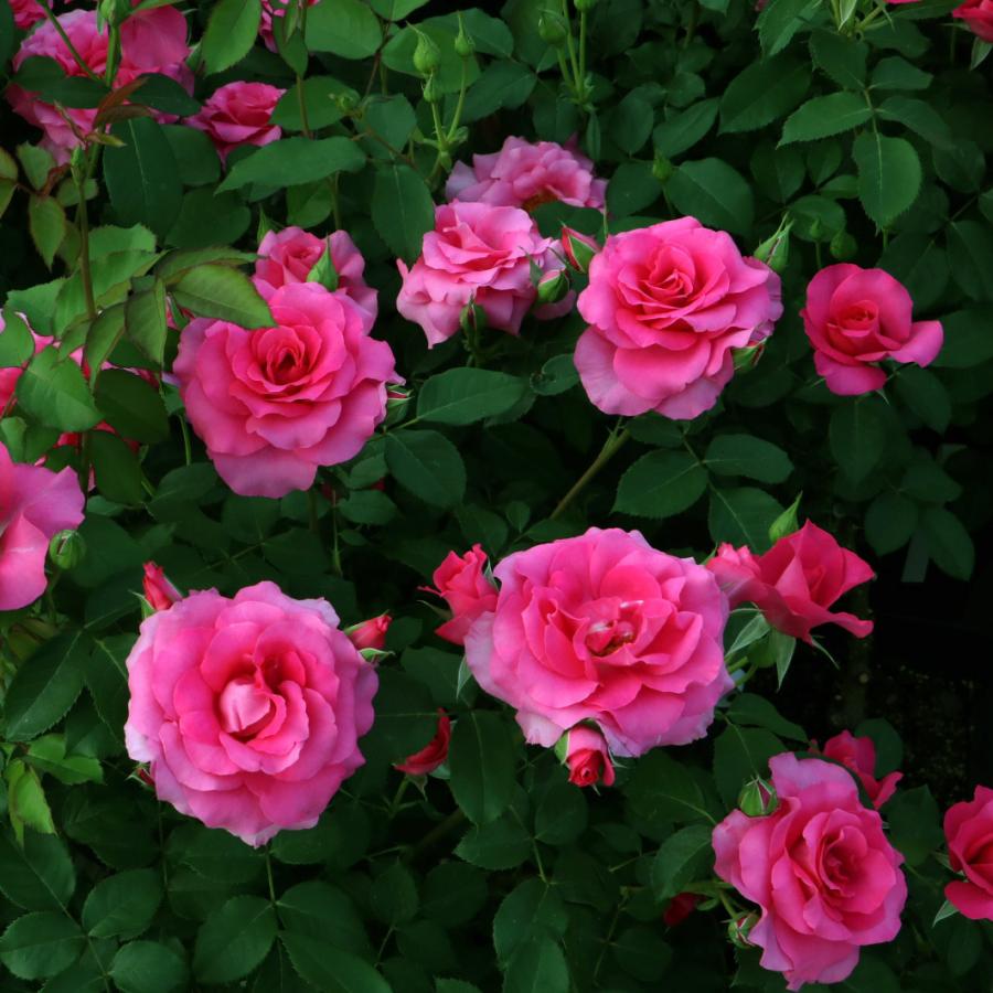 明るく鮮明な濃いローズ色の花は3~5輪くらいの房咲きで丸弁平咲き。