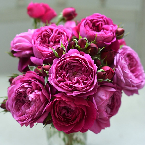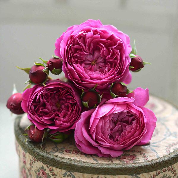 青みがのったローズ色の花は、形の良いロゼット咲きで花の中心部はボタン・アイになる。