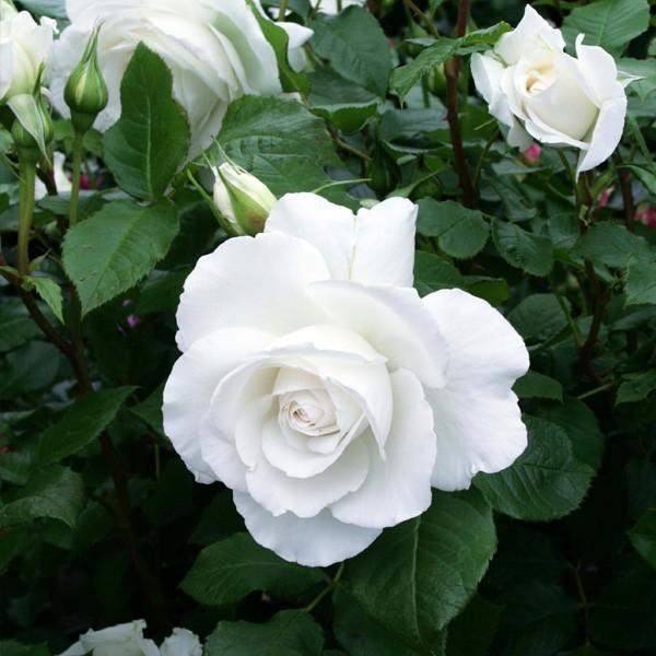 純白な花は1~3輪の房咲き、丸弁高芯咲きで強いフルーツ香がある。