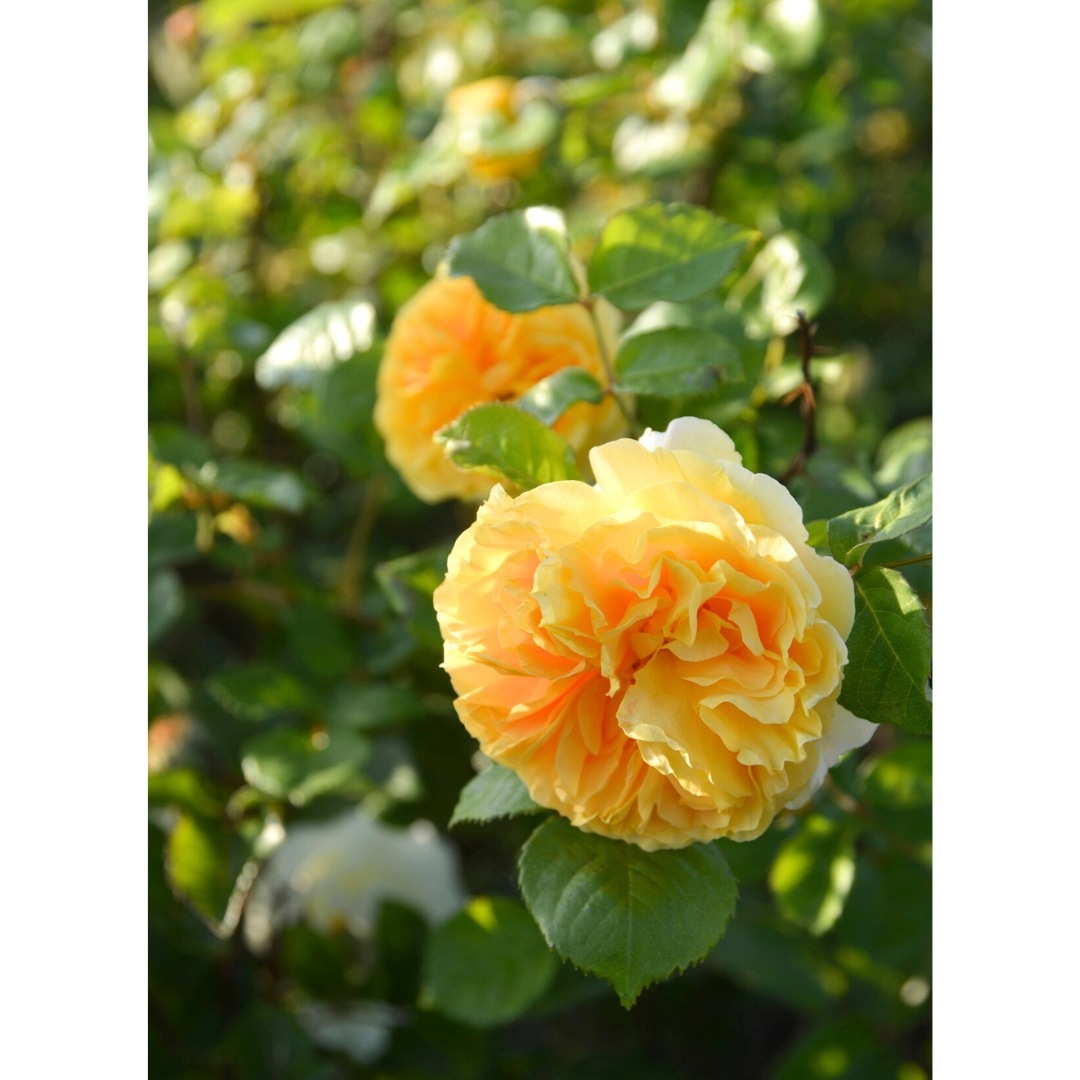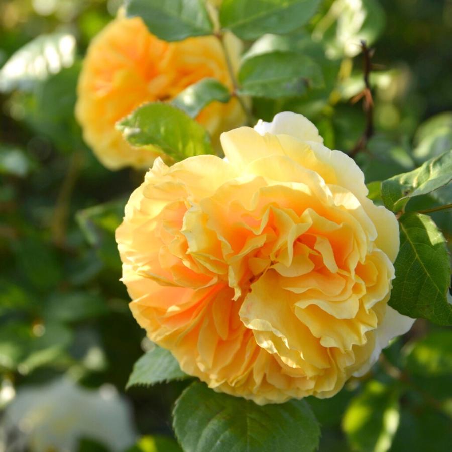 オレンジがかる明るく鮮やかな黄色、ゆるやかなロゼット咲き、中輪房咲きの花。