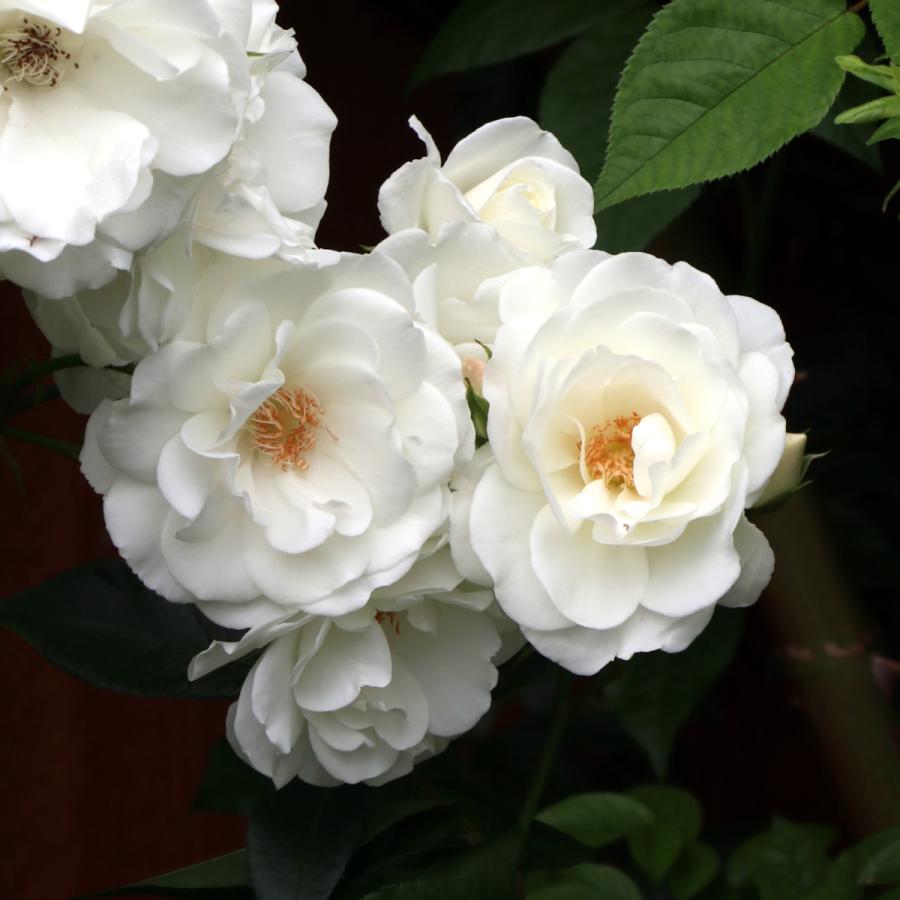 純白色の花は3~5輪の房咲きで八重咲き、つぼみの時はやや桃色を帯びる。