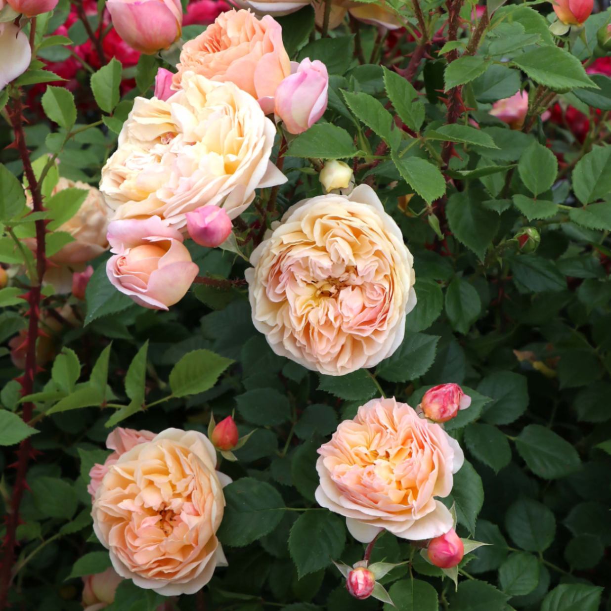 アプリコット色の花は、カップ咲きで咲き始め開くとロゼット咲きになる。