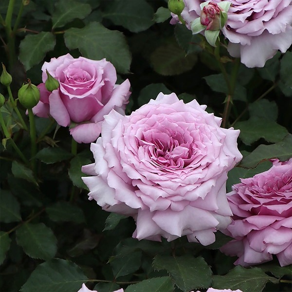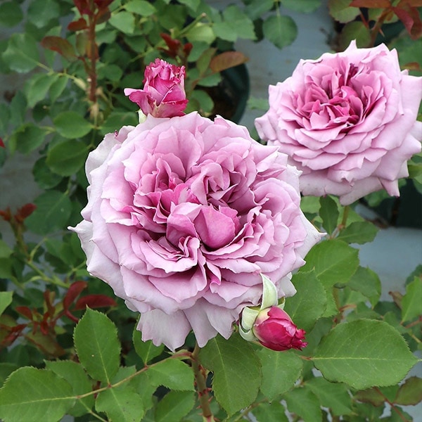 ラベンダー色がのった桃色の花は、剣弁で咲き始め開くとロゼット咲きになる。