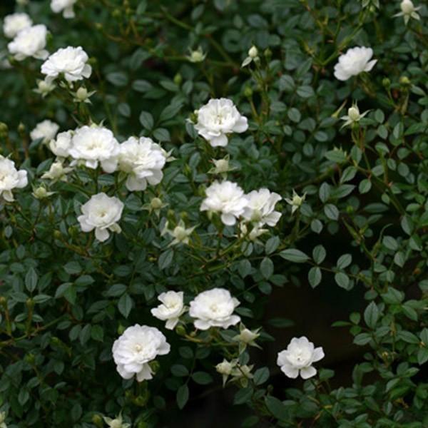 純白の花はポンポン咲きで数輪の房で咲く。