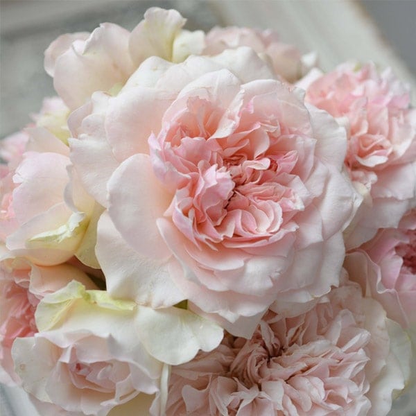 淡桃色の花は花弁が重なった花芯部が濃い色となり特徴のあるロゼット咲き。