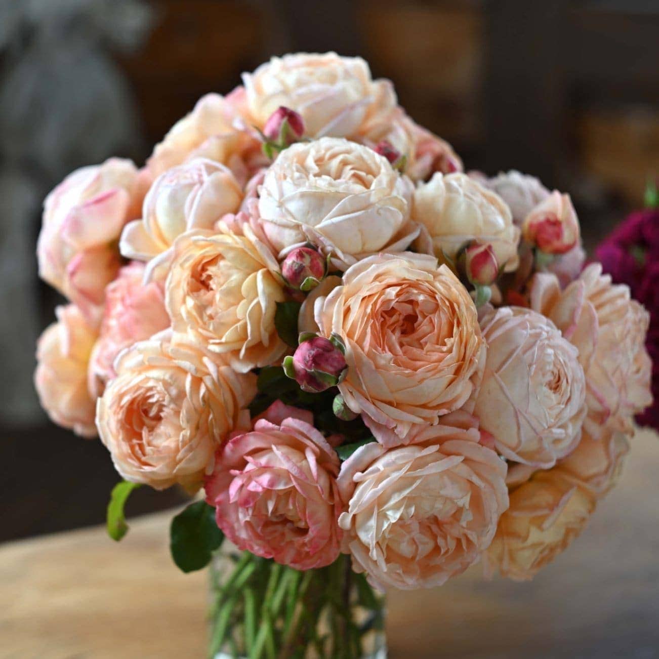 アプリコット色の花は、形の良いカップ咲きで咲く時に低温だと桃色が強くなる。