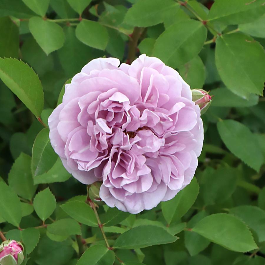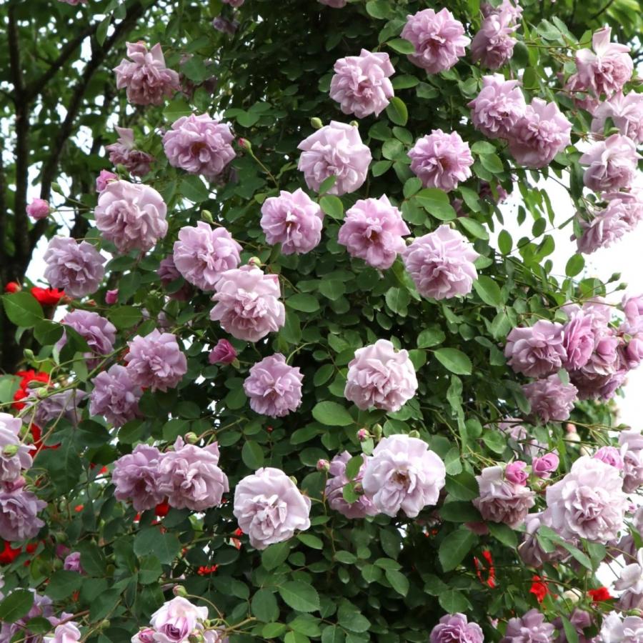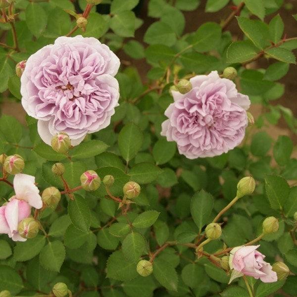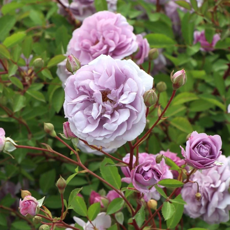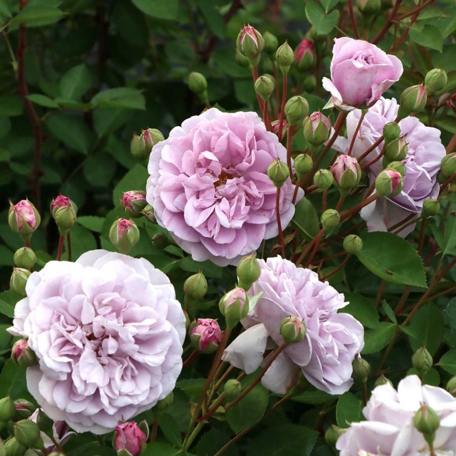 ライラック色の花は中輪で3~5輪の房で咲く。開ききると黄色いしべが見え花色との相性も良い。